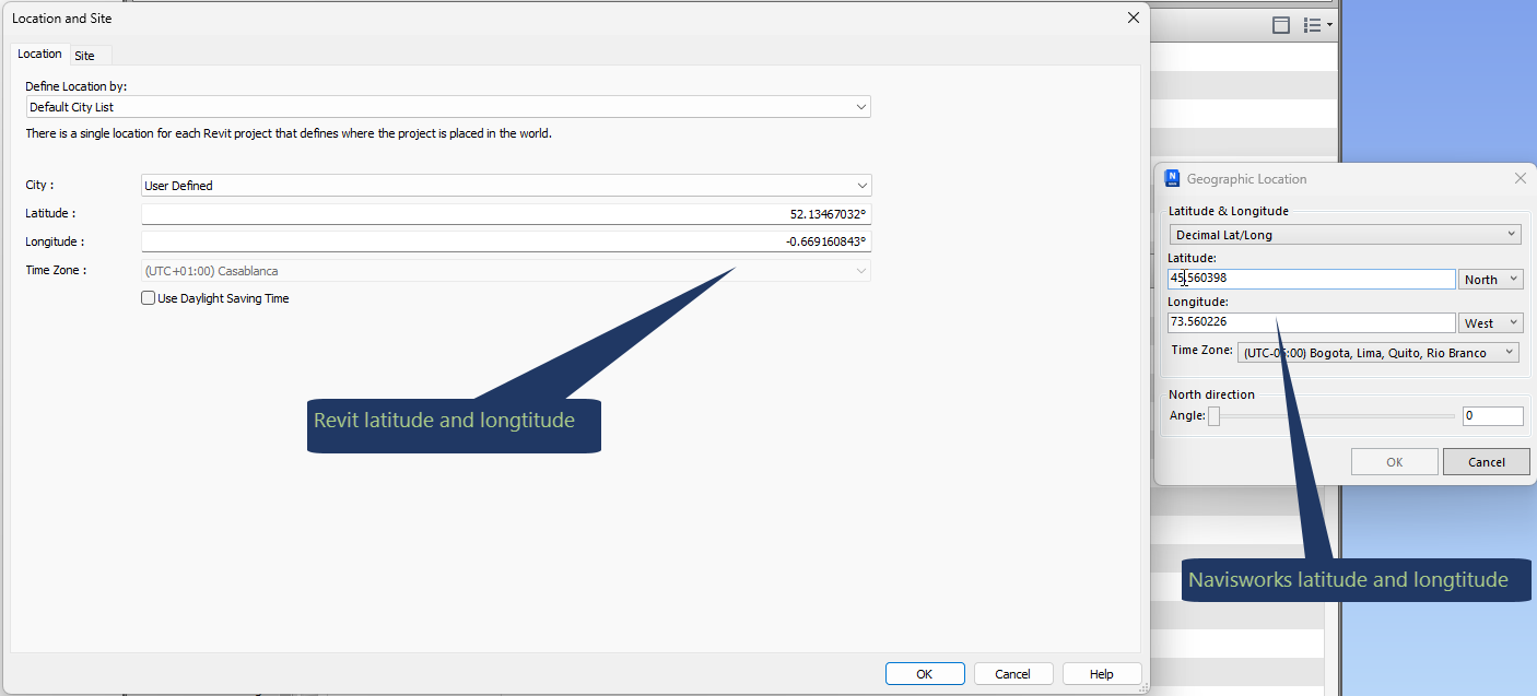 Just like Revit has a default location, frequently somewhere in the environs of Boston, Navisworks appears to come with a default location in Montreal. Synchronizing an NWD file directly will position the model either in Montreal or at a recalculated position, depending on the source file information. As a result, even a perfectly geolocated Revit file might not be aligned correctly when appended to Navisworks and synchronized as an NWD.