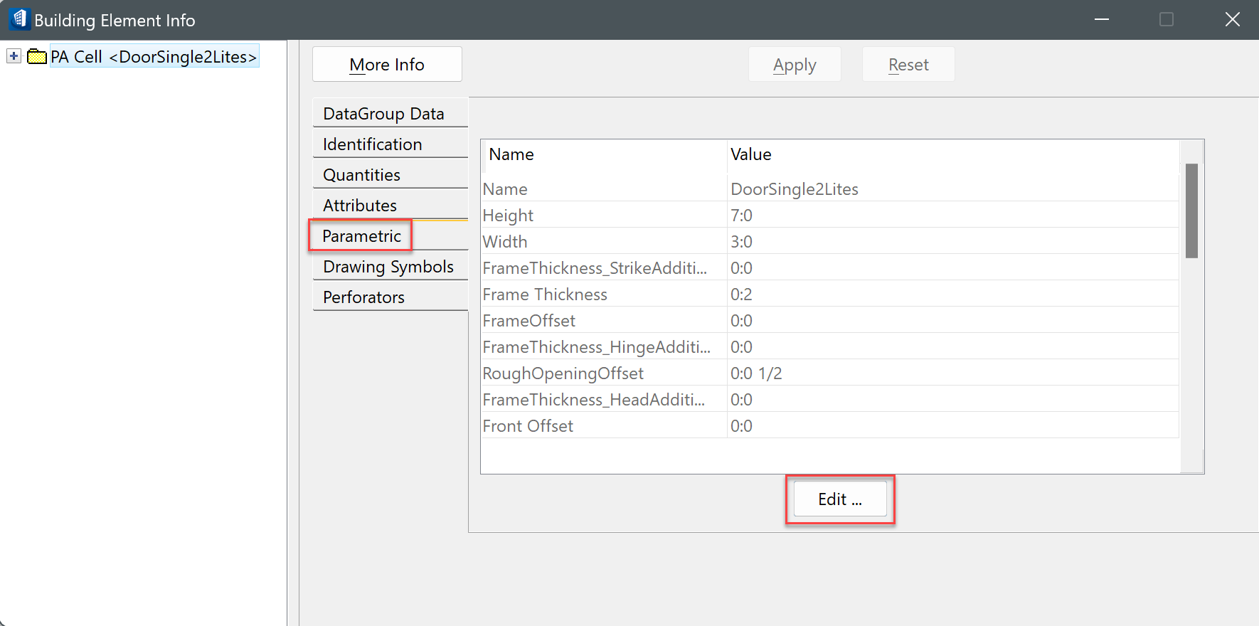 2. In order to modify an existing component that uses BXF cell, select this element and go to the Building Element Info - Parametric - Edit.