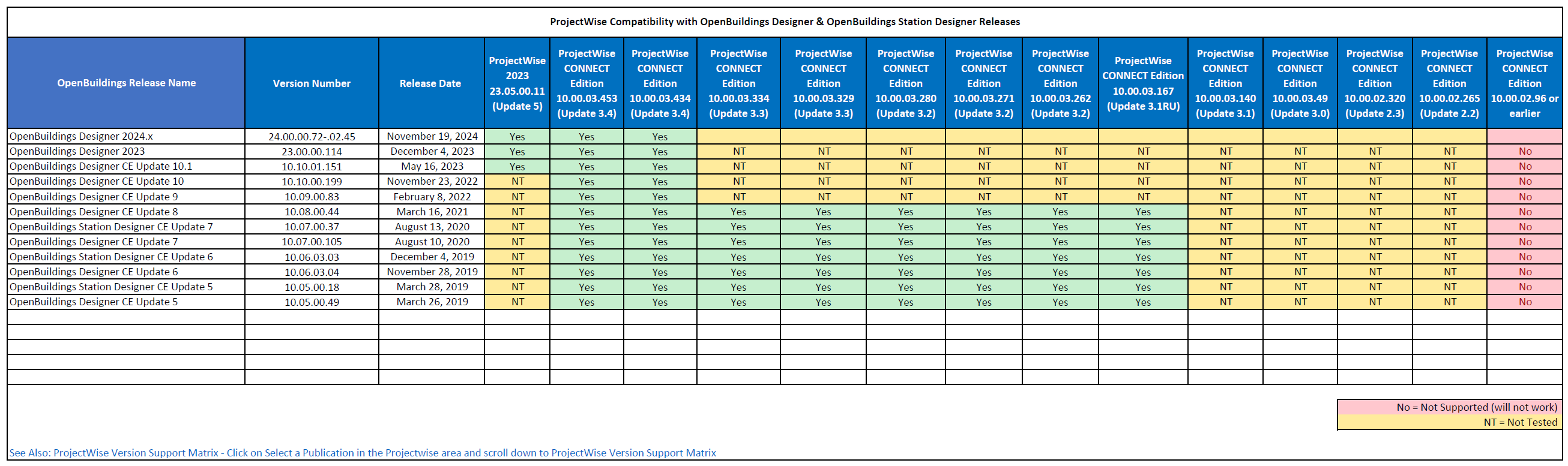 Following are the compatibilities across different released versions of OpenBuildings Designer and OpenBuildings Station Designer with ProjectWise. The compatibility matrix is available in PDF format and can be downloaded below: