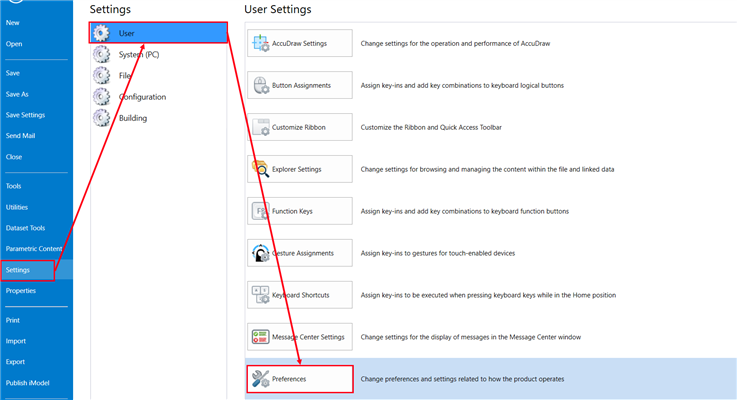 1. Open a DGN file in OpenBuildings Designer. Then open the ‘Preferences’ dialog by choosing File>Settings>User>Preferences: