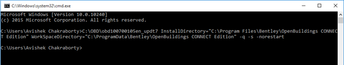 C:\OBD\obd100700105en_updt7 InstallDirectory="C:\Program Files\Bentley\OpenBuildings CONNECT Edition" WorkSpaceDirectory="C:\ProgramData\Bentley\OpenBuildings CONNECT Edition" -q -s -norestart