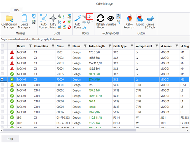 5.Click on Delete Route in the Route ribbon group from the ribbon menu to delete the routing information for the selected cable.