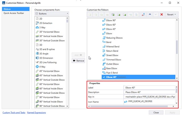 - In properties section, set the button's Label, Description and Icon as required. Set Key-in as mechaddin place EC_CLASS_NAME dsc=Piping. For example, For 40 degree pipe elbow we will set key-in as mechaddin place PIPE_ELBOW_40_DEGREE dsc=Piping