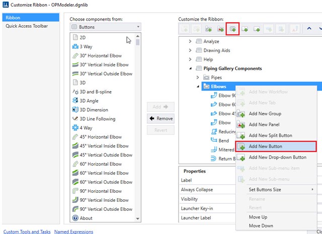 - Under Customize Ribbon Dialog, from right hand pane (Customize the Ribbon section). Expand OpenPlant Modeler node and expand Piping Gallery Component node. Further expand Elbows node
