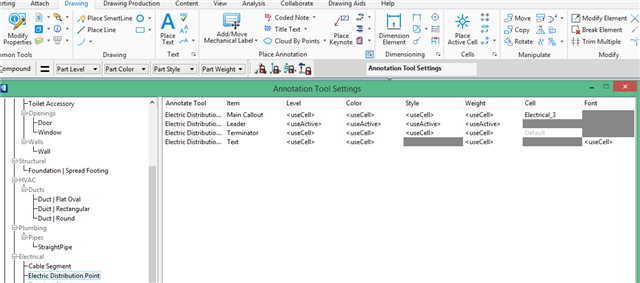 - Next, we've selected the new "Electrical_3" cell as the default for Electrical Distribution Point, the DataGroup category under which panels and switches fall.