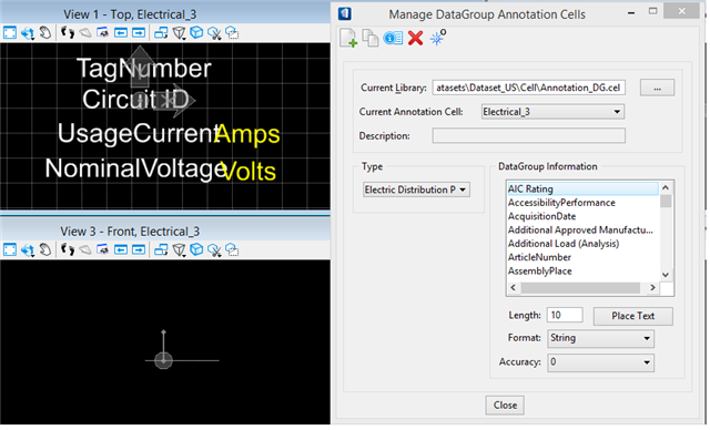 - This image shows the properties used for a new electrical annotation cell - the text in yellow was manually added to display units next to the amp and voltage properties.