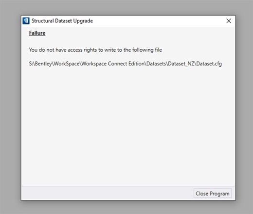 This error indicates that the application does not have edit rights to the dataset.cfg file. If you have any existing version of this file, Update 7 will attempt to edit the file to add the required ProStructures related variables as mentioned here. Check your read/write permissions to the ..Your_Location\Configuration\Datasets\Dataset_Name\ folder to insure that editing rights are available at the file level. Note that when using certain NAS systems you may need to add permissions specific to that system's environment that are beyond standard Windows permissions. For example, if using Synology you may have to enable Advanced Share Permissions as outlined in this page from the manufacturer's website: https://www.synology.com/en-global/knowledgebase/DSM/help/DSM/AdminCenter/file_share_privilege_asp. Once the dataset.cfg file is updated you may be able to reset your permissions back to their normal state.