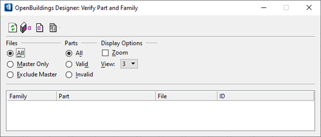 To use the Verify Parts utility the WorkSet will need to contain some DGN files (File > Utilities > Part Utilities > Verify Parts. Help: Verify Part and Family)