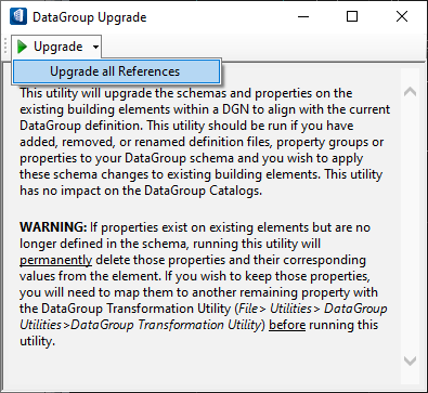 Decide whether structural elements will be upgraded from the legacy building tools to work with the ProStructures functionality available from OpenBuildings Designer Update 7 onwards. This is a one way upgrade that offers additional capability, for an overview of this capability please see this playlist: OpenBuildings Designer: Next Generation of Structural Elements - YouTube.