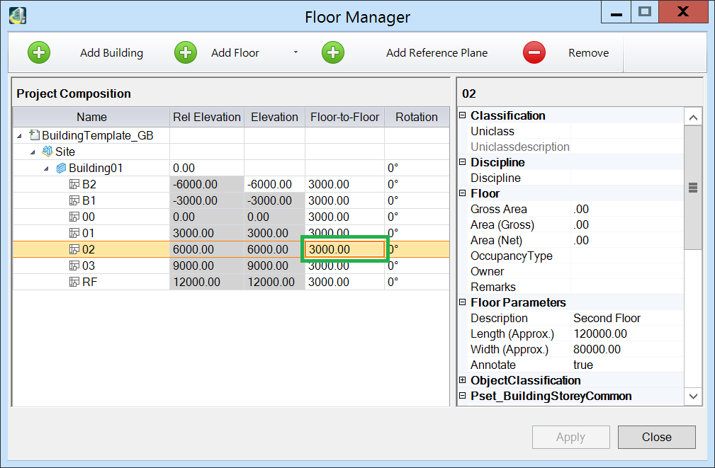 Floor to floor values control the floor heights, their actual and relative elevations are calculated and displayed alongside:
