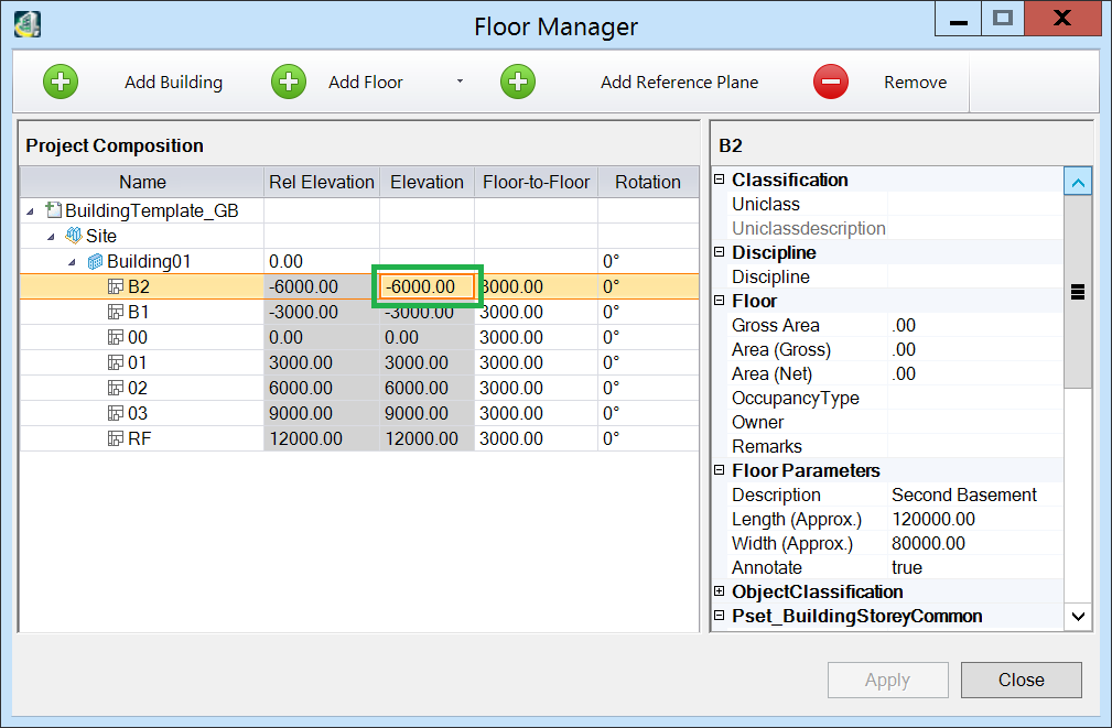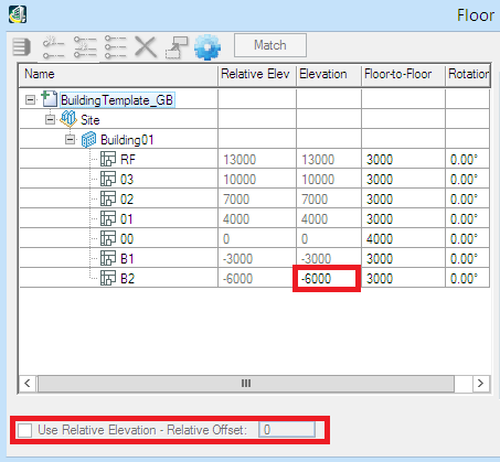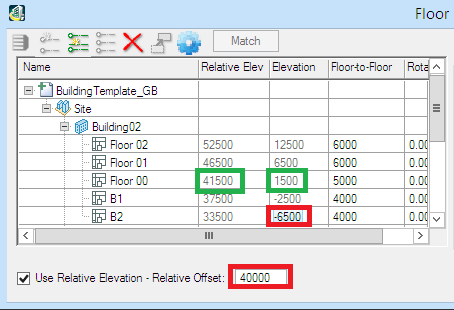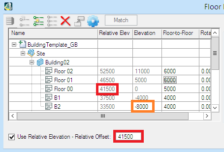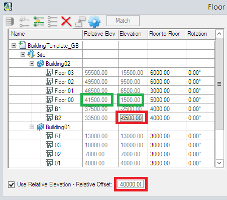 Alternatively, use the site datum of 40000 as the Relative Offset then set B2 to -6500 resulting in Floor 00 having an elevation of 1500. The Relative Elevation of 41500 is the same but the floor heights are expressed treating the site datum as zero.
