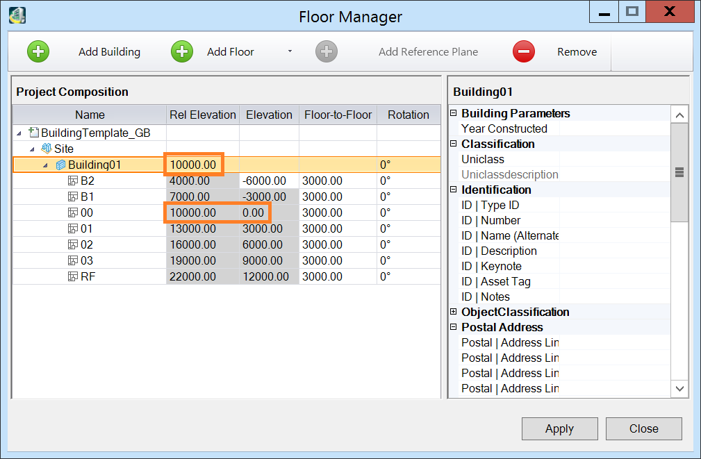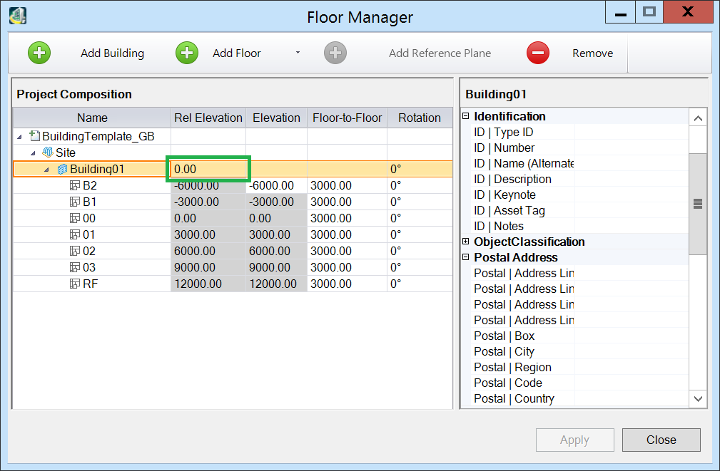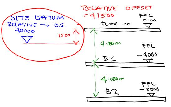 Note that the offset is relative to 0, so in this example setting Floor 00 to 0 and adding the site datum of 40000 to the height of Floor 00 above the datum the Relative Offset value required to show Floor 00 as 0 is 41500: