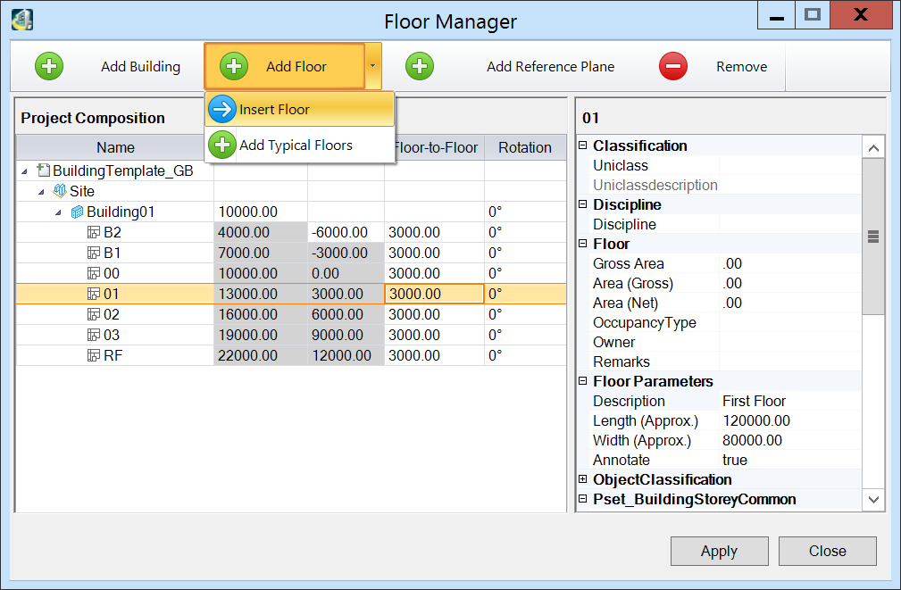 The Insert Floor tool enables new floors to be inserted in the list updating floors above: