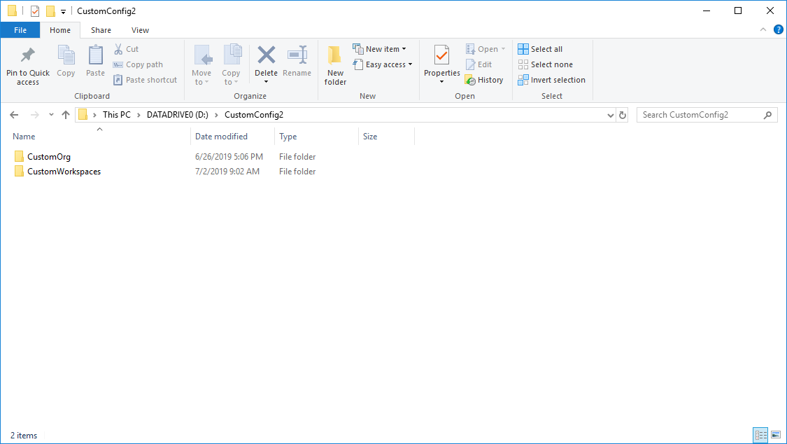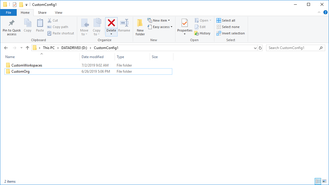 Let us consider that there are two configuration locations on the D: drive (the configurations can reside on different drives, the path, used later, would change based on that), D:\CustomConfig1\ and D:\CustomConfig2\. Under each of these folders, there must be a Workspaces folder and an Organization folder. For this example, let us consider that we have the following folders in each of the above mentioned locations: