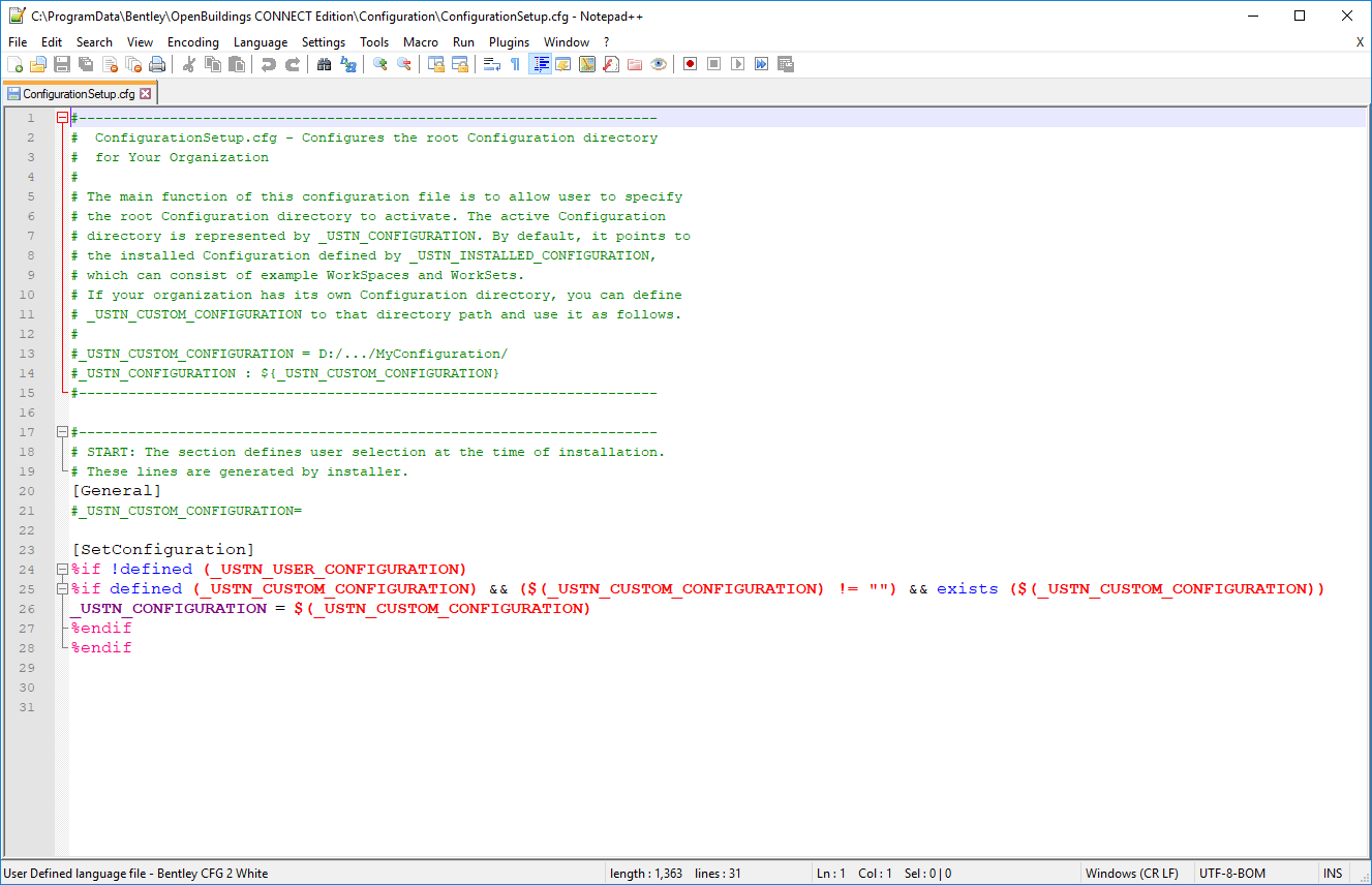 At this stage, we need to go to the installed configuration location, which is, typically, at C:\ProgramData\Bentley\OpenBuildings CONNECT Edition\Configuration\. We need to open the file called ConfigurationSetup.cfg and put a "#" before, typically, line number 21, which says "_USTN_CUSTOM_CONFIGURATION=". Then we would need to modify, typically, line number 26, so that the end result says, "_USTN_CONFIGURAITON = $(_USTN_CUSTOM_CONFIGURATION)"