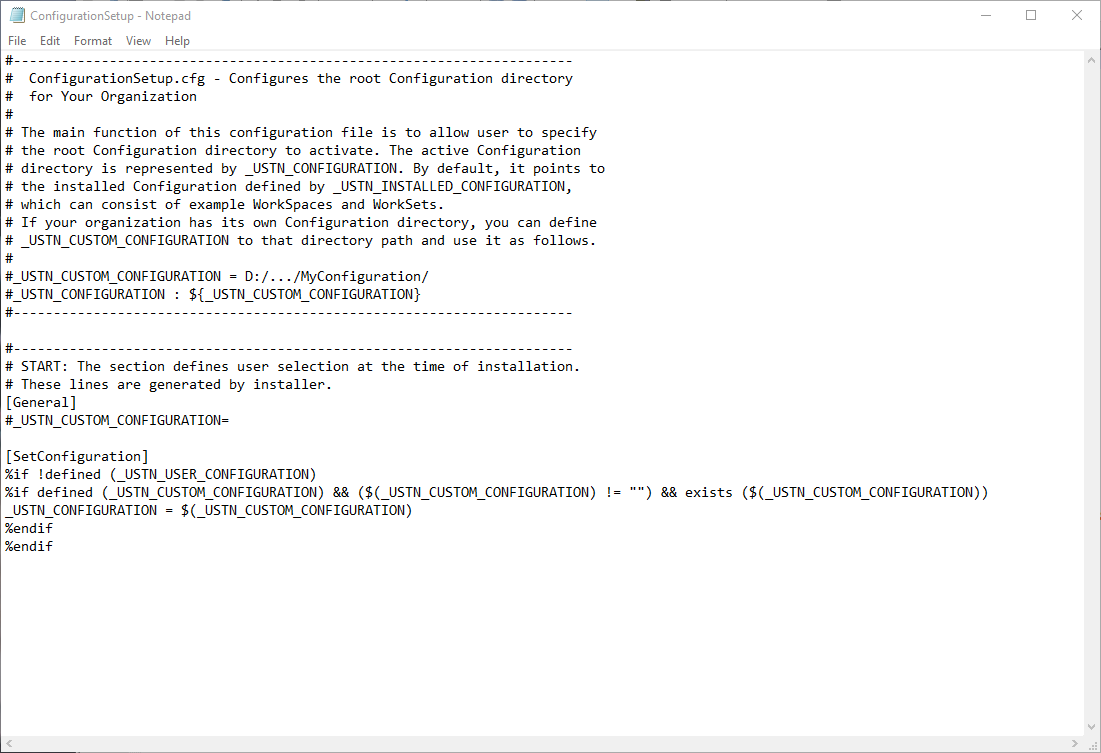 #-------------------------------------------------------------------------------| # The following code is for configuring the Organization folder. This can vary | # depending on the name and the location of the Organization folder. In the | # following example, it is considered that _USTN_CONFIGURATION points to | # the CustomConfig1 or CustomConfig2 (whichever is applicable) folder and the | # Organization folder is under this folder with the name CustomOrg. | #-------------------------------------------------------------------------------| MY_ORGANIZATION_LOCATION = $(_USTN_CONFIGURATION)CustomOrg/ %if defined (MY_ORGANIZATION_LOCATION) && exists ($(MY_ORGANIZATION_LOCATION)) _USTN_ORGANIZATION = $(MY_ORGANIZATION_LOCATION) %endif #-------------------------------------------------------------------------------| # The following code takes care of the Workspaces location just as the previous | # one does for the Organization folder. The same considerations as above are | # made here as well. This can change depending on the folder structure. | #-------------------------------------------------------------------------------| MY_WORKSPACES_LOCATION = $(_USTN_CONFIGURATION)CustomWorkspaces/ %if defined (MY_WORKSPACES_LOCATION) && exists ($(MY_WORKSPACES_LOCATION)) _USTN_WORKSPACESROOT = $(MY_WORKSPACES_LOCATION) %endif