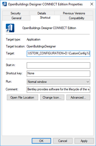 In the last part of this exercise, we need to create new shortcuts of OpenBuildings Designer on the Desktop for each of the configuration locations. For our example, we would need two. We need to go to the properties of each of the shortcuts and modify the Target field as follows: