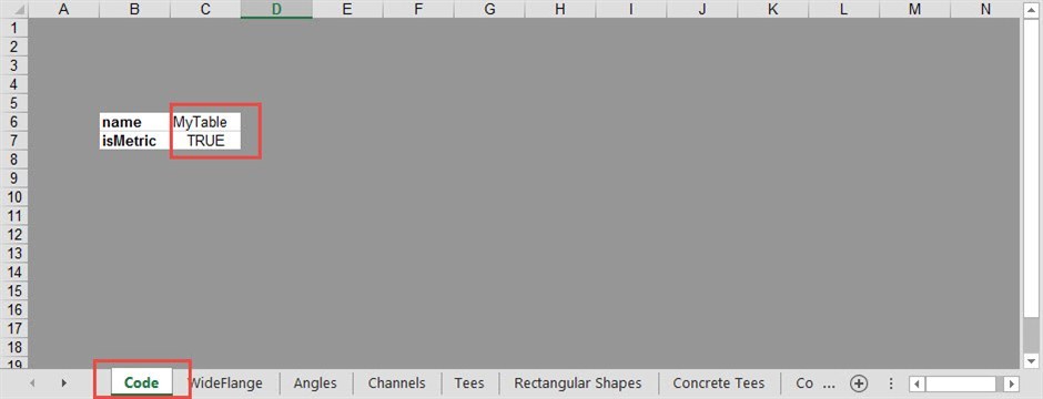 In the StructuralShapesTemplates.xls file, make sure you have the two entries in the CODE worksheet (the first worksheet), "name" and "isMetric" filled in. The name field is what you will see in the Structural Sections dialog box. The isMetric field is either TRUE or FALSE.