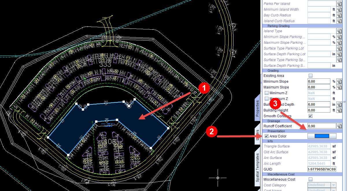 Note: Colors for buildings, with height set, will color the entire object. Object that are created by the layout solver can have the value set, however, if the layout solver is turned on then the color will be removed with the area.