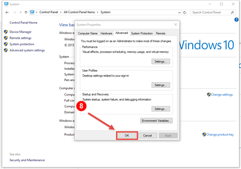 8. On the System Properties dialog, click the OK button