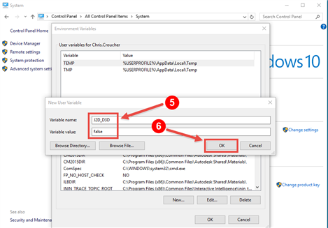 4. On the Environment Variables dialog, click the New button in User Variables section (Note: users might want to use a System Variable, which might require higher permissions. Consult your IT professional)