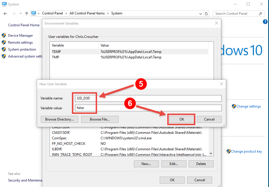 5. In the Variable name textbox, type J2D_D3D and in the Variable value textbox type false