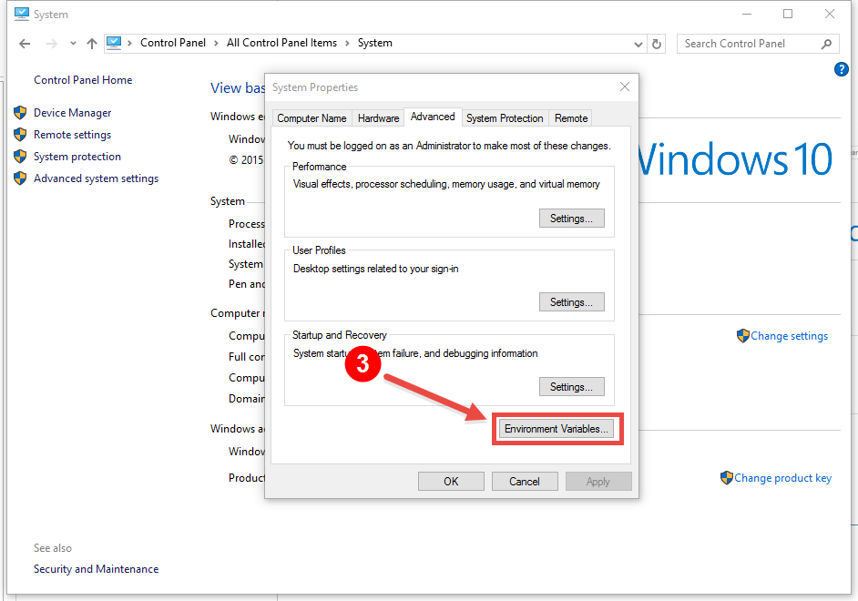 3. On the System Properties dialog, click the Environment Variables… button