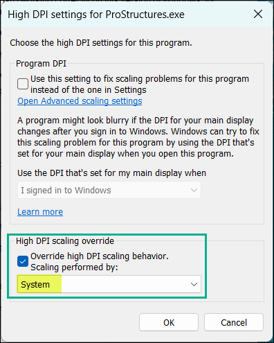 3. Enable Override High DPI Scaling Behavior and select the System from the dropdown then click OK.