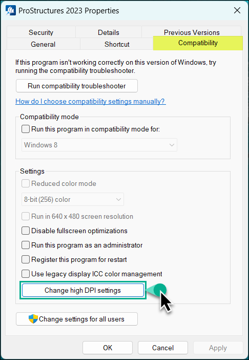 2. Go to Compatibility tab and click on Change High DPI Settings.