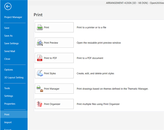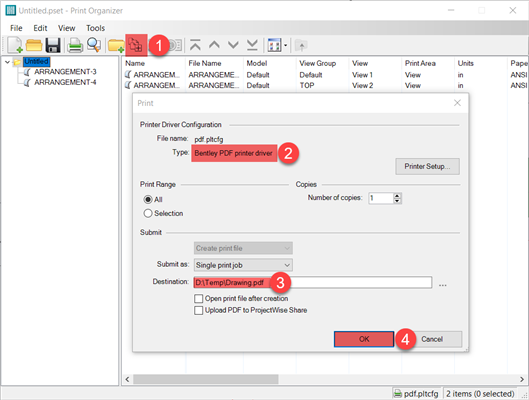 3. Click on Print >> Select the Bentley PDF Printer Driver. Specify the path for Destination of PDF and click OK.
