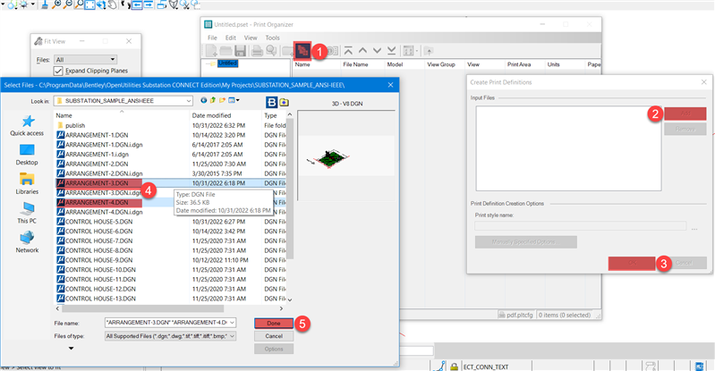 2. Click on Add Files to Set and click on Add in Create Print Definition dialog. Browse to the location of the Project Pages and select multiple DGNs by using Ctrl key and click on Done and OK.