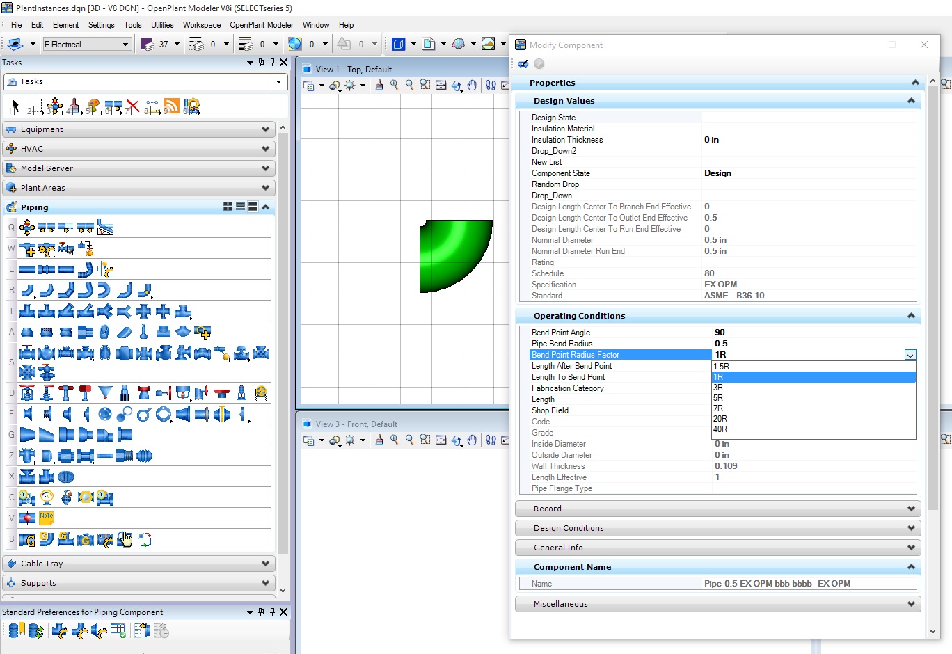 - After drawing the pipe bend, verify that the Modify Component Operating Conditions created the Bend Point Radius Factor from the created list. Data can be selected and the radius is now able to be altered by the New List.