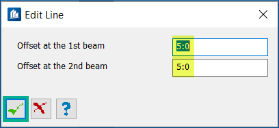 3. Now, select the 1st main beam and then 2nd main beam, the Edit Line dialog appears. Enter the required offset values at 1st and 2nd beam. These offset values will be considered on at which end of the main beam you have selected. In this case, we have selected mains beam at the bottom hence offset will be counted from the bottom.
