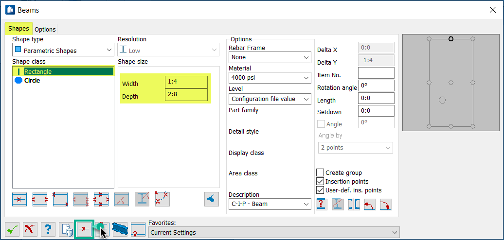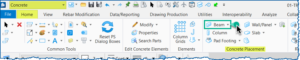 1. Open the Beam dialog located at Concrete workflow > Home > Concrete Placement > Beam.
