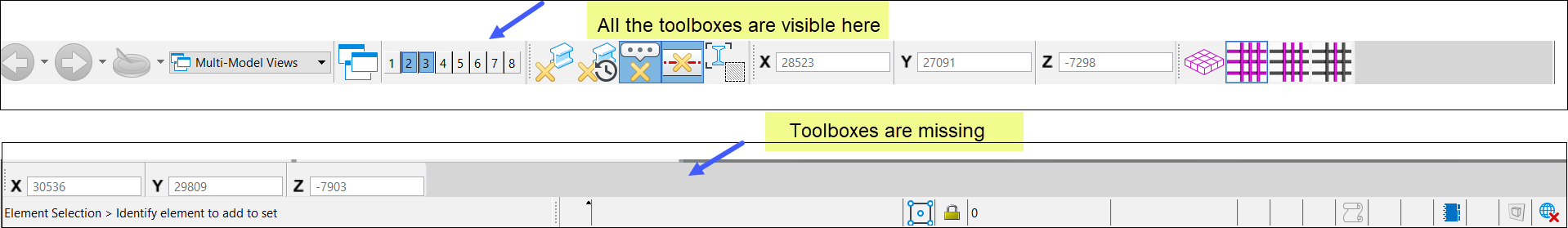 A) The tool boxes are not appearing at the bottom