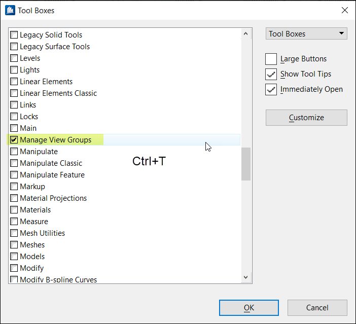 2. Press Ctrl+T which will open the dialog for the display of Tool Boxes and make sure the toolbox which you are looking for is turned on for display.