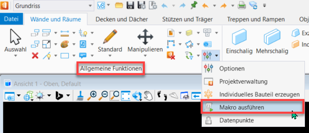 Starten Sie Speedikon und öffnen Sie einen beliebigen Grundriss. Gehen Sie in der Gruppe Allgemeine Funktionen und Makro ausführen.