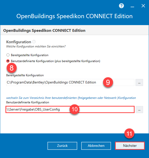 - Wir empfehlen die Benutzerdefinierte Konfiguration (plus bereitgestellte Konfiguration) zu wählen. Beim Aktualisieren einer OpenBuildings Speedikon Installation, wählen Sie bitte die identische Konfiguration aus, wie bei der bestehenden Installation.