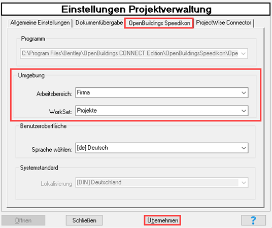- Wählen Sie den Arbeitsbereich und das WorkSet aus und bestätigen Sie mit Übernehmen.