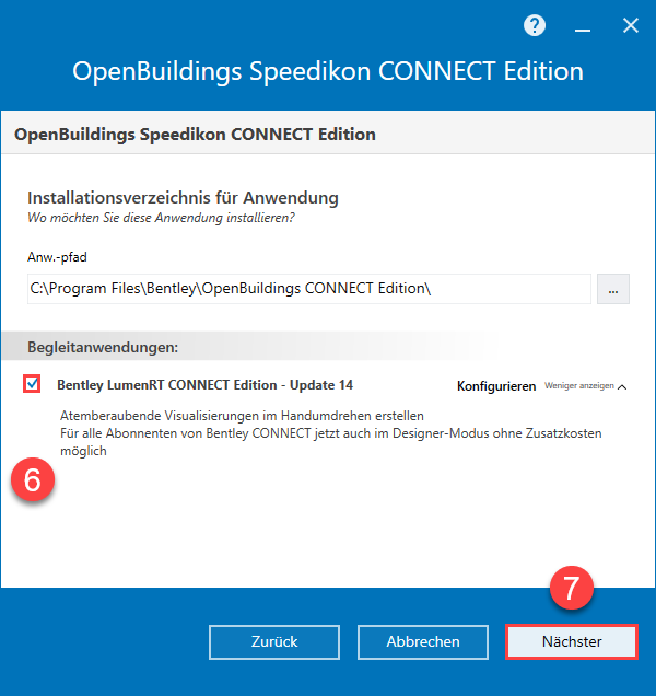 - Als Begleitanwendung können Sie zusätzlich kostenlos Bentley LumenRT Designer CONNECT Edition Update 14 installieren. Mit LumenRT Designer können Sie schnell und einfach ansprechende Visualisierungen erstellen. Als Speedikon Anwender mit aktivem Bentley Vertrag, können Sie zusätzlich OpenBuildings Designer ohne Kosten installieren und verwenden. Laden Sie OpenBuildings Designer separat über Software-Downloads herunter und installieren es, so wie gewünscht.