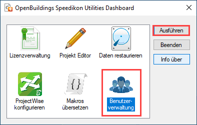 - Wenn Sie die Benutzerverwaltung nutzen möchten, starten Sie diese über das OpenBuildings Speedikon Utilities Dashboard. Dieses finden Sie im Start Menu von Windows unter OpenBuildings Speedikon.