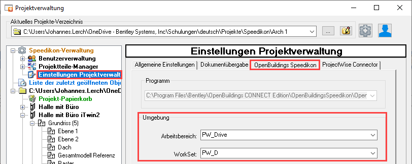 Wo kann man in OpenBuildings Speedikon den Arbeitsbereich und das WorkSet in der Projektverwaltung auswählen?