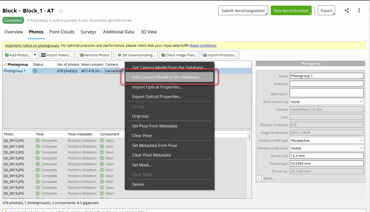 - Go to the Photos tab of the Block and right click on the Photogroup. Click << add camera to database >>.