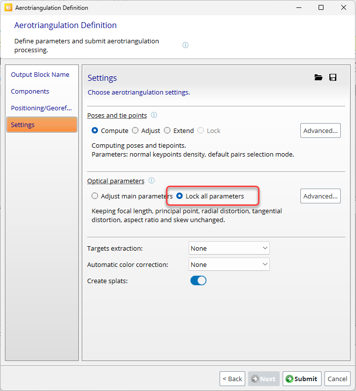 - In the Aerotriangulation Definition Settings, under Optical parameters select the option "Lock all parameters".