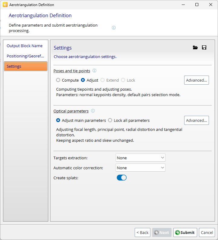 - Submit an aerotriangulation. In the Aerotriangulation Definition Settings keep the settings set at default