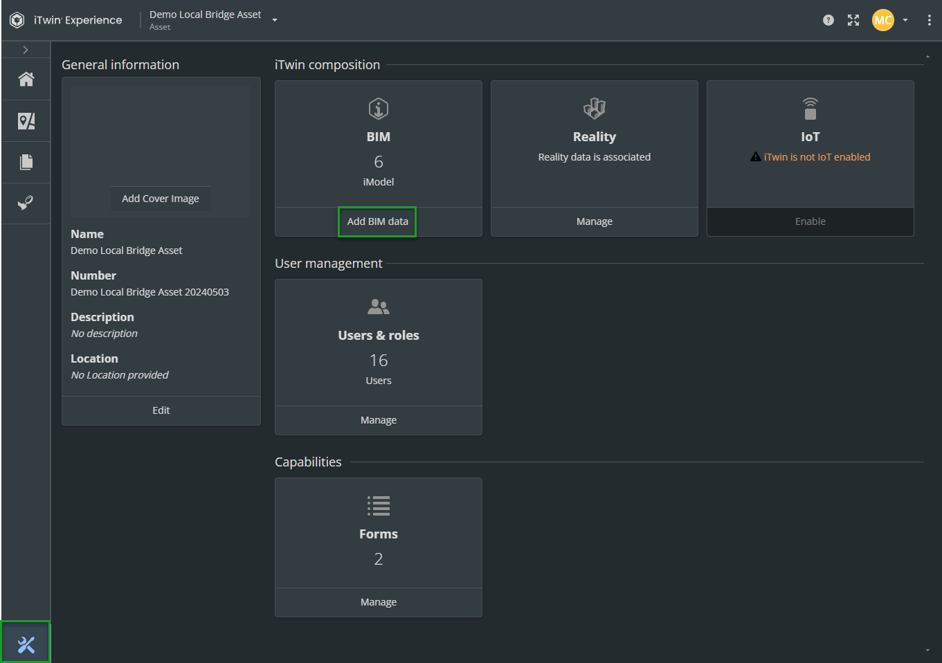 You can manage the BIM data associated to your iTwin by clicking on the Manage button from the BIM data tile located in your iTwin Configuration page.
