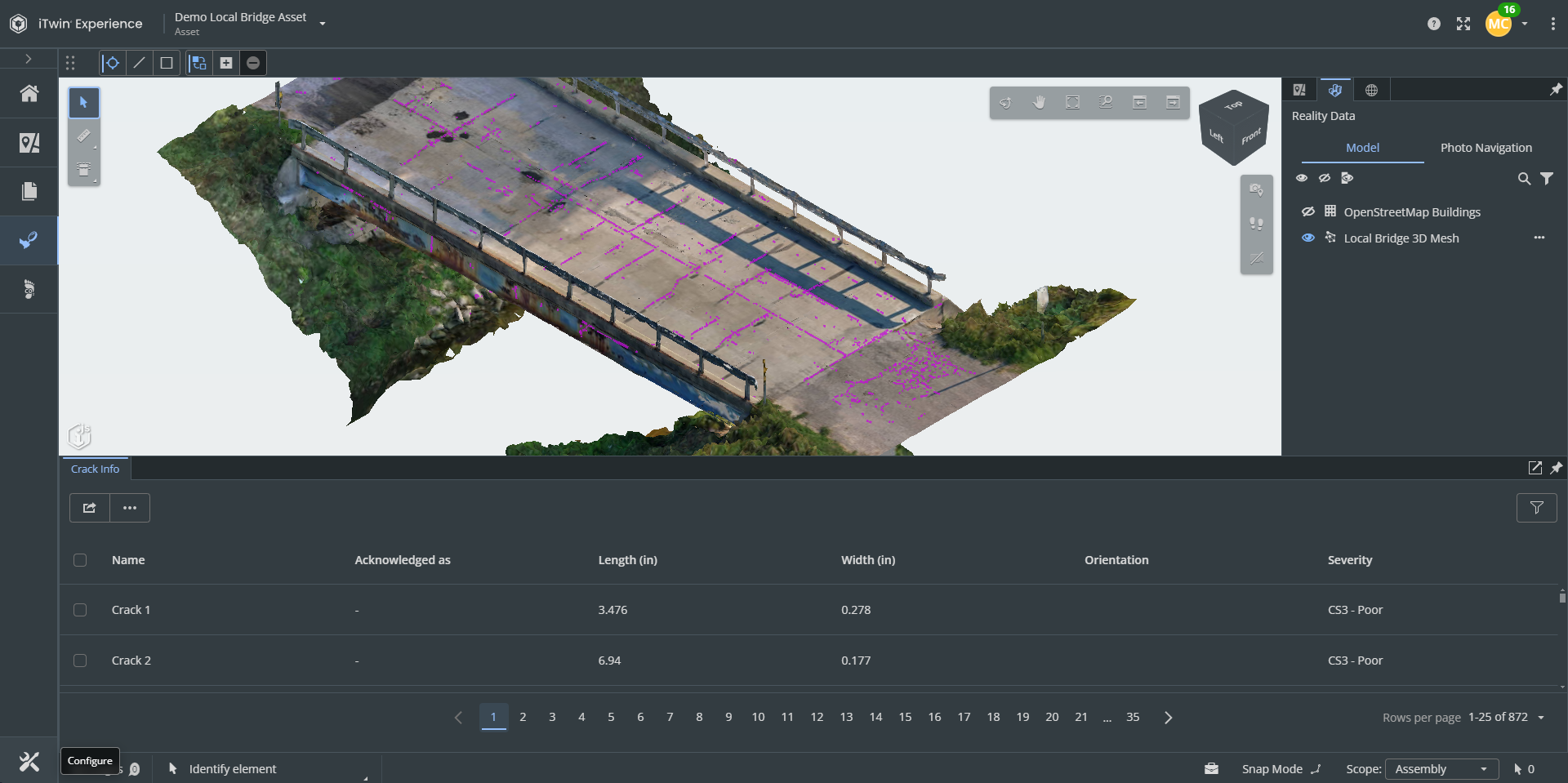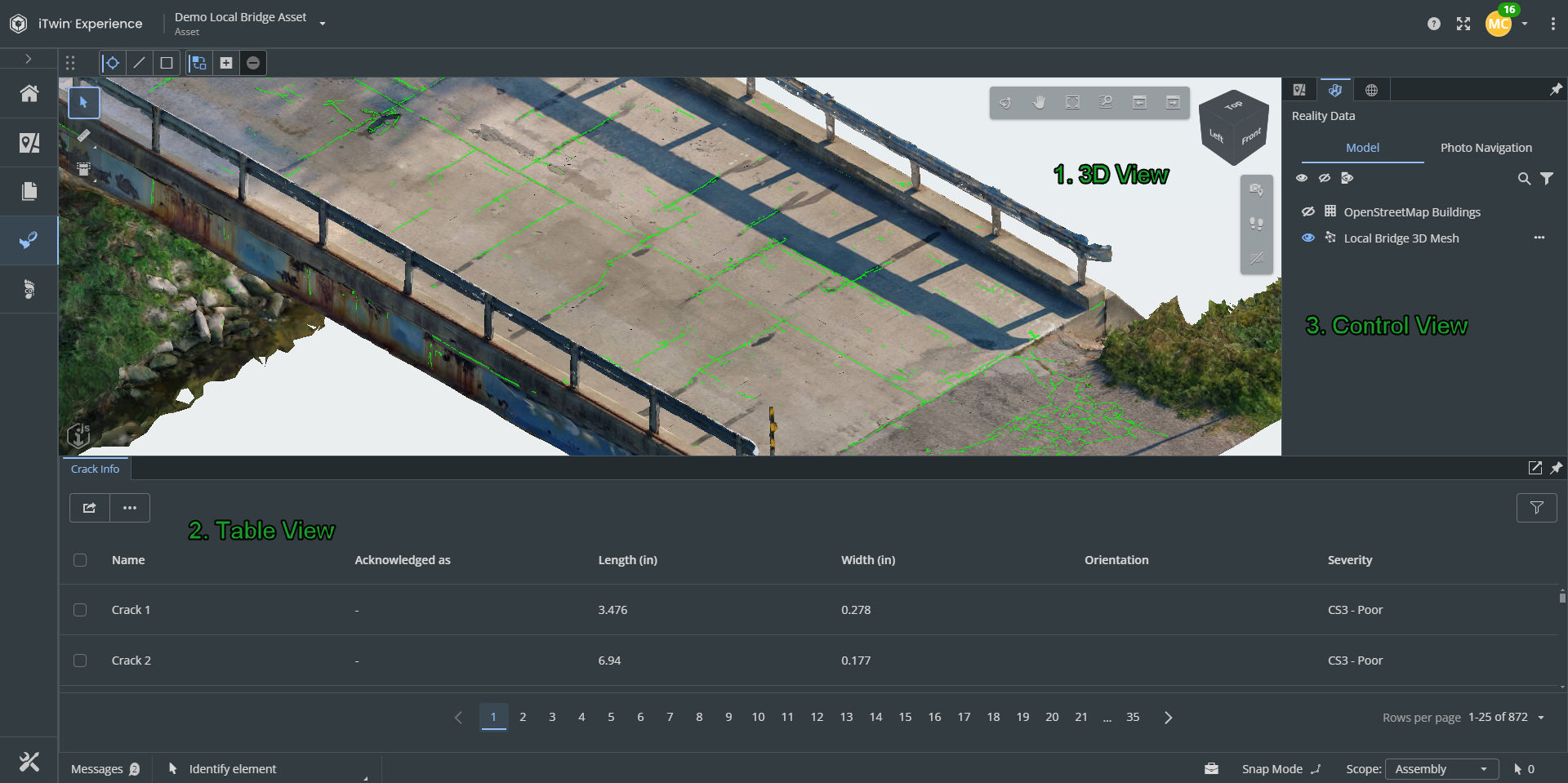The 3D View shows the crack detection and the associated Reality Model. If you have multiple Reality Models, it will select the model corresponding to the selected 3SM at run time.