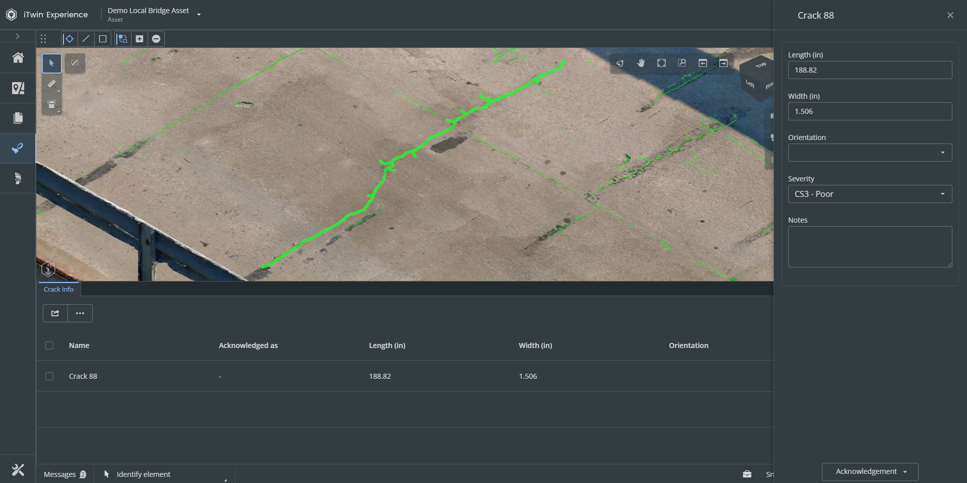 Each crack is either selectable from the 3D View or from the Table View. When selecting a crack, it will automatically zoom you to its position on the 3D view and filter it in the Table View.