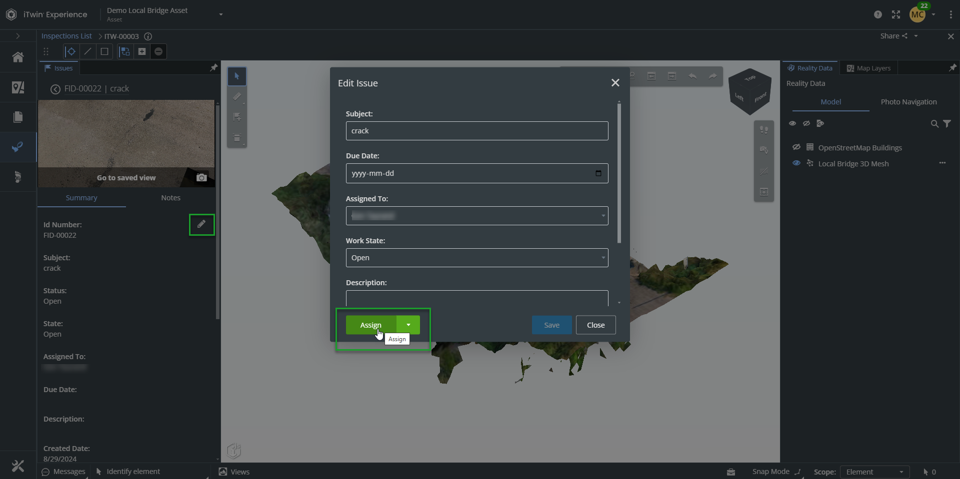 You can enter the new information in the specified fields. As you click the Assign button, it will set the issue in a new assigned state. The color of the flag will change to orange.