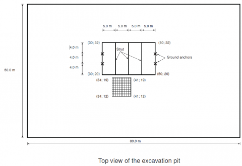 This lesson describes the construction of an excavation pit in soft clay and sand layers. The pit is a relatively small excavation of 12 by 20 m, excavated to a depth of 6.5 m below the surface. Struts, walings and ground anchors are used to prevent the pit from collapsing. After the full excavation, an additional surface load is added on one side of the pit.
